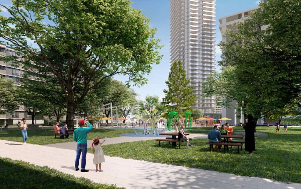 OGDC has partnered with WJ Properties, one of the original developers of high-rise apartments in Flemingdon Park, to usher in a new era of growth around the Ontario Line Subway and Eglinton Crosstown LRT. Located less than 200m from the planned Flemingdon Park Subway Station, and centered around a new public park, this four-tower infill project will bring new opportunities for homeownership to the area. The design approach is focused on maximizing outdoor amenity space and landscaping, in keeping with the Site’s unique location along the Don River Valley and E.T. Seton Park. Current and future residents will enjoy new sidewalks and paths that connect to transit, the proposed new park and area amenities. New outdoor amenities are planned to include sport courts, terraces and areas dedicated to play, fitness, picnics, and pets.